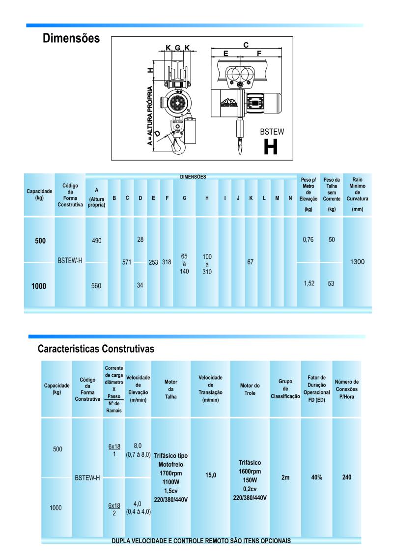 Talha elétrica acoplada por carro manual Capacidades 500 e 1.000 kg Dimensões e características construtivas